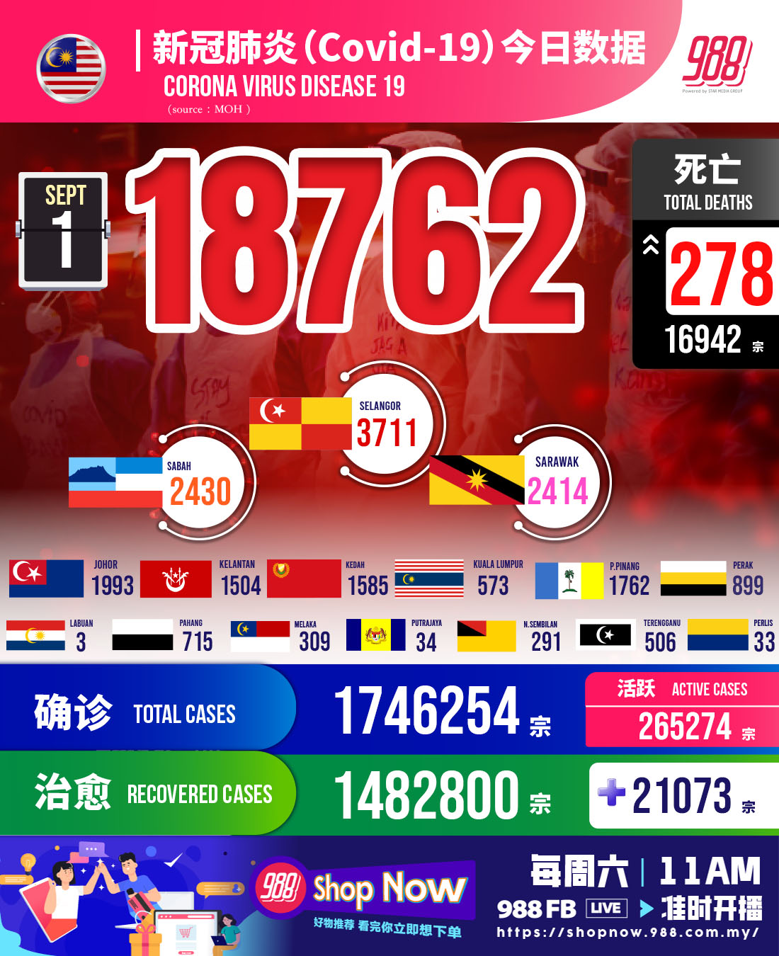 卫生部通报,截至1日12pm,我国新增 #18,762例,累计病例至今 #1,765,016 宗,新增278死累计#16,942死。