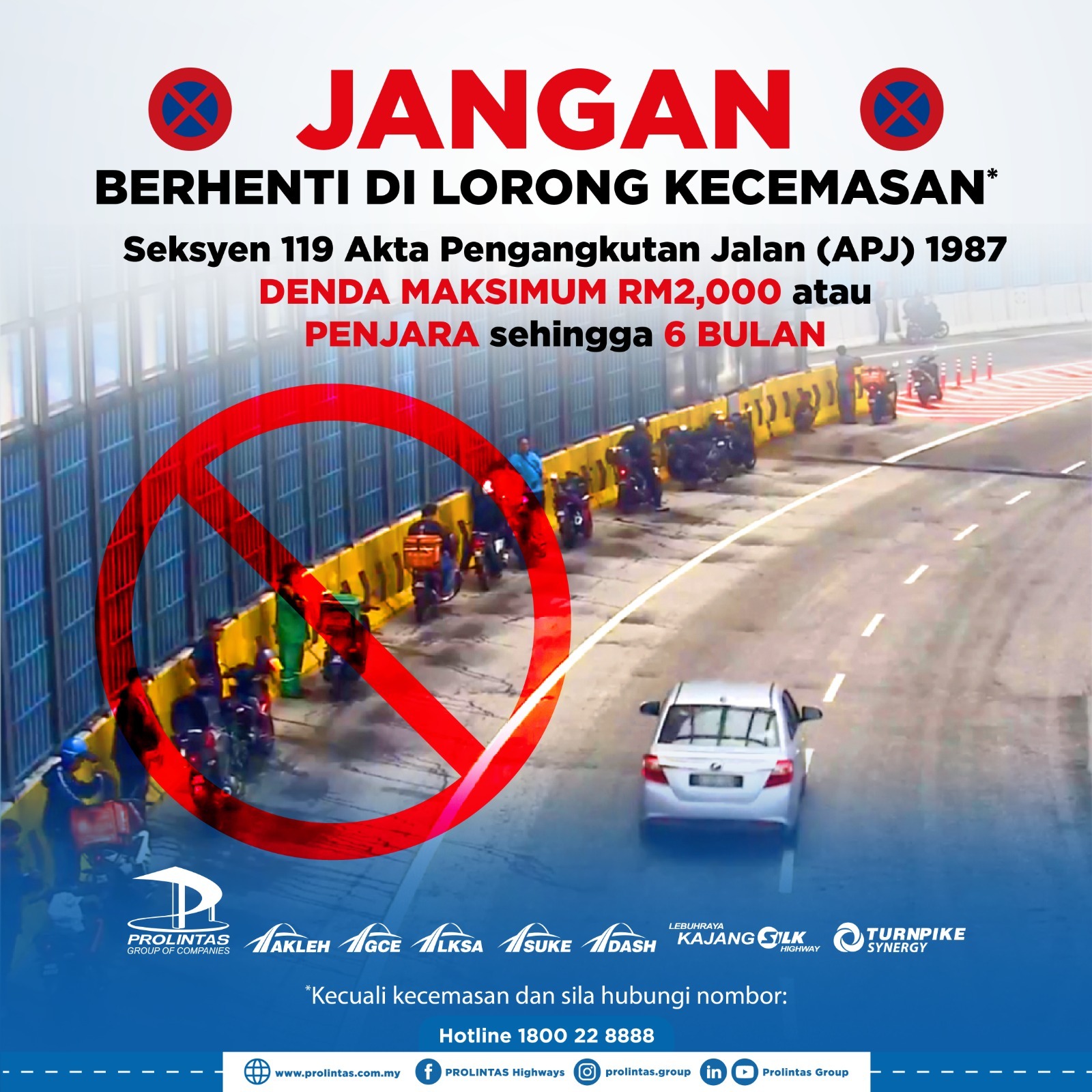 Prolintas大道公司提醒,霸占紧急车道是违法的,罪成可被罚款最高2000令吉或监禁6个月。