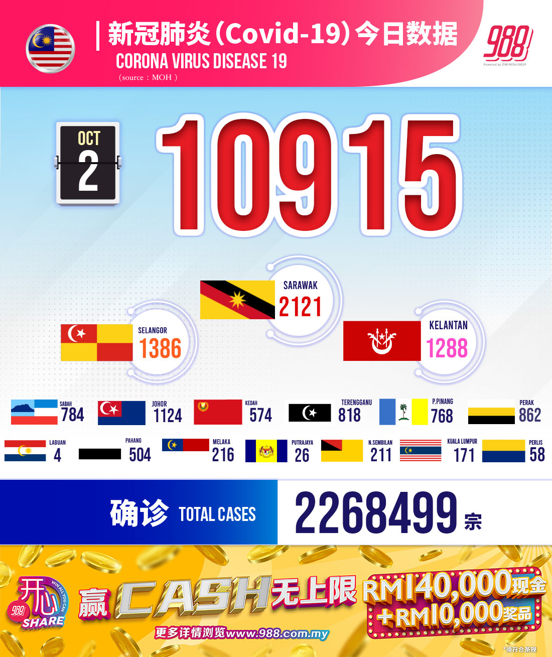 卫生部通报,截至2日12pm,我国新增 #10,915宗,累计病例至今 # 2,268,499 宗。