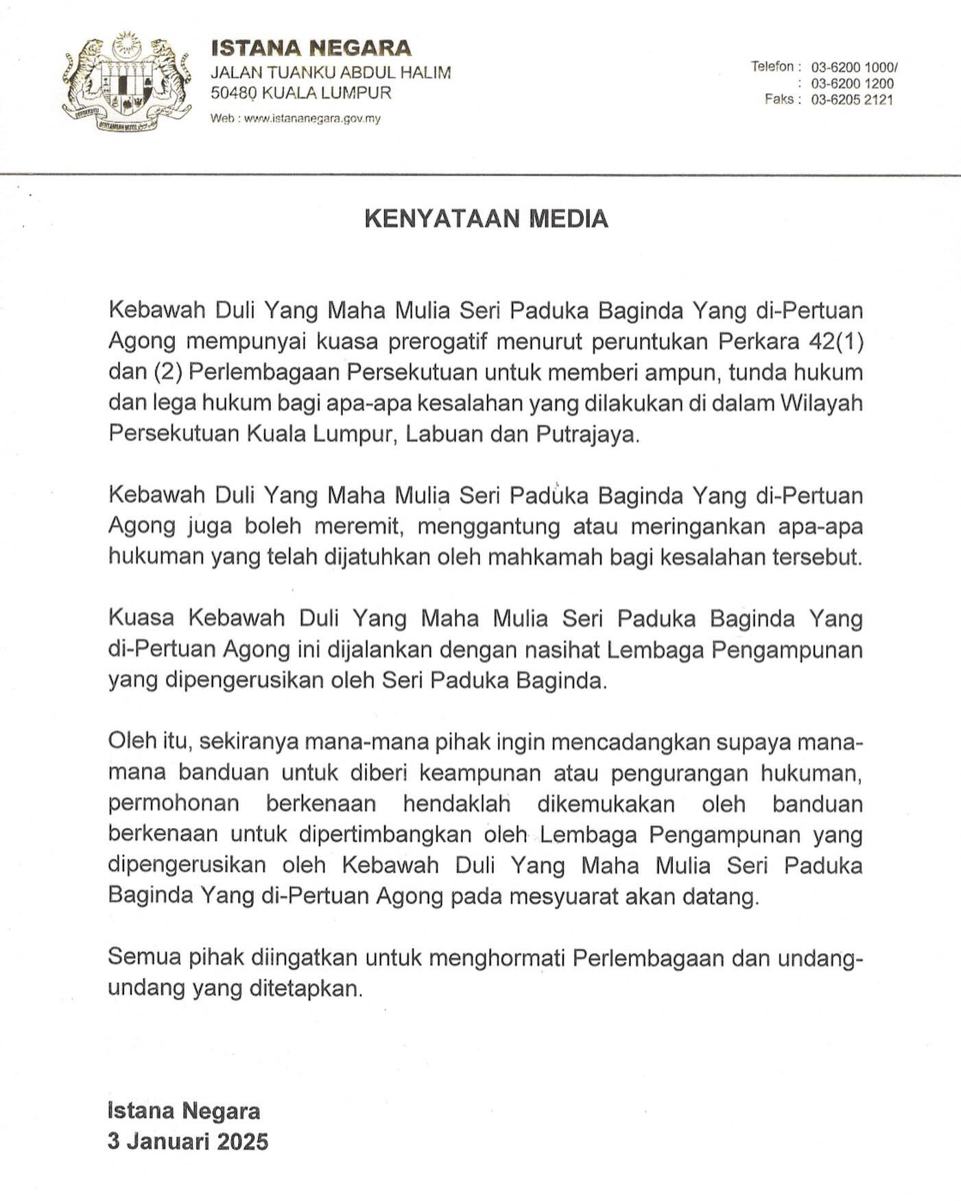 国家王宫今日发声明指出,根据联邦宪法第42(1)条款,国家元首有权对在吉隆坡、纳闽及布城犯下的任何罪行给予特赦、缓刑或减刑。