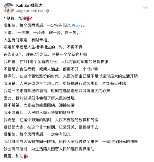 她在中文脸书专页发文指,7月份,人民将面对沉重的通货膨胀,她深知,在百物涨价的时代,人民的薪金已经不足以应付庞大的生活开销。