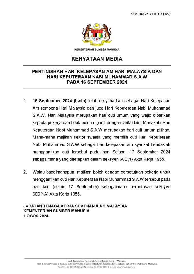 西马劳工局发文告指出,9月16日的马来西亚日是私人界的强制性公共假期,不能以其他日期取代。