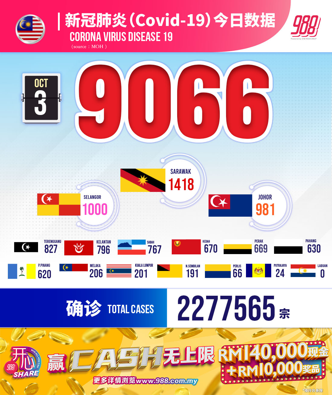 卫生部通报,截至3日12pm,我国新增 #9,066例,累计病例至今 # 2,277,565 宗。