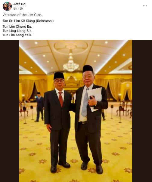 此外,行动党日落洞前国会议员黄泉安也在脸书发布一张林吉祥昨日配合国家元首诞辰册封仪式到国家王宫彩排的照片,他在文中以“丹斯里”称呼林吉祥。