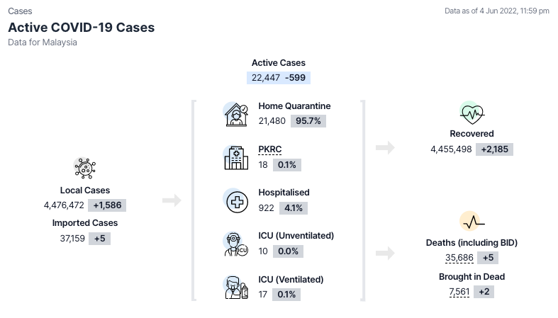卫生部COVIDNOW网站通报,截至4日11.59pm,我国新增 #1,591例,累计病例至今 #4,513,631 宗。
