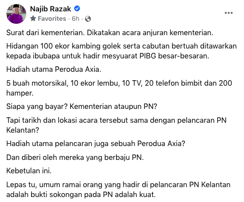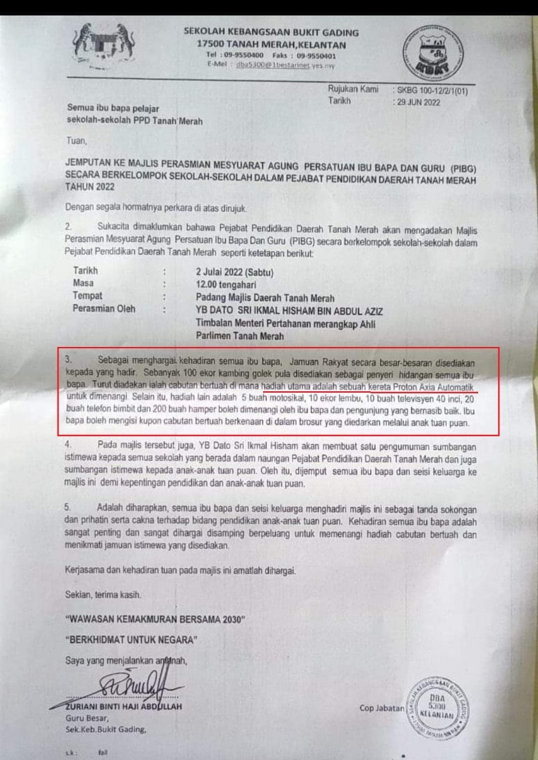 纳吉在脸书上载一张武吉加汀国小校长的信函,内容为本月2日举办的家教协会大会开幕礼,由依克马希山主持开幕,幸运抽奖的大奖是一辆Perodua Axia。