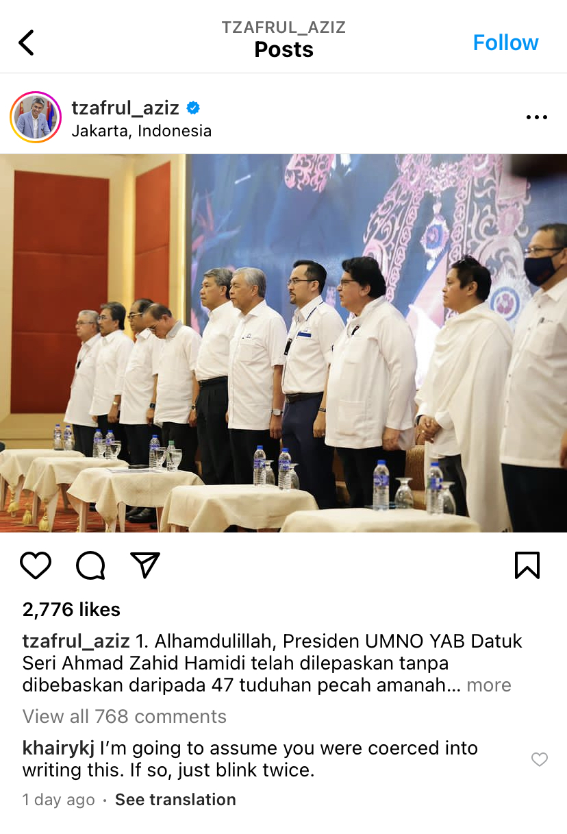 另外,投资、贸易及工业部长东姑扎夫鲁发文称,对阿末扎希的释放表示感谢上苍,并指在大马的司法和法律独立制度下,总检察长有权发起或停止提控,尊重这项决定,更表示,对巫统来说这是很好的机会,作为团结政府的一份子,继续专注于提升国家经济和人民繁荣。