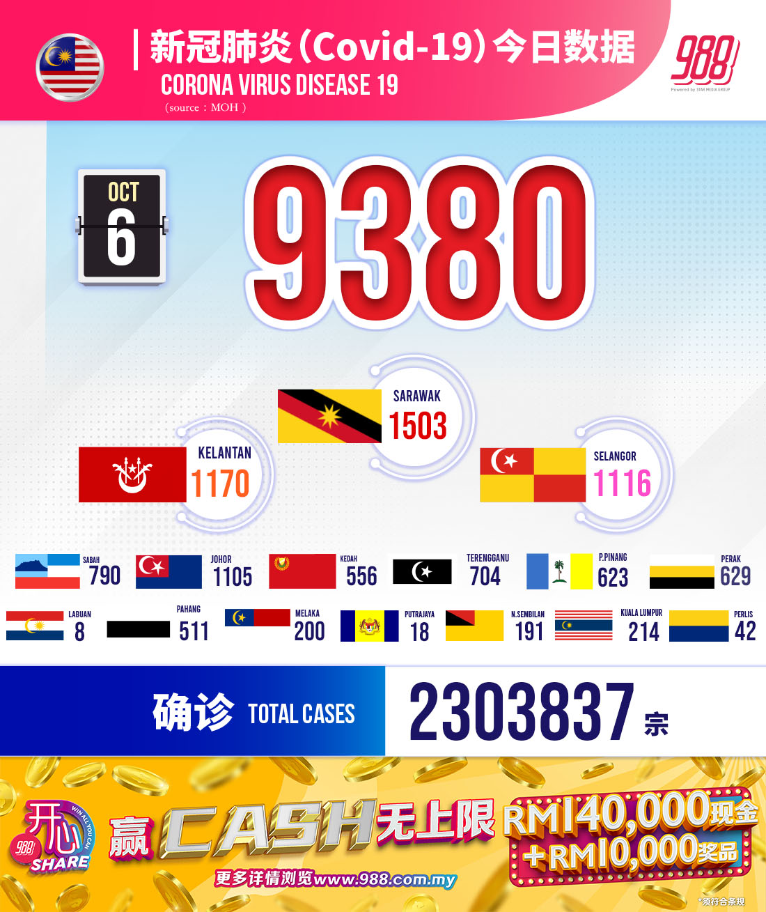 卫生部通报,截至6日12pm,我国新增 #9,380例,累计病例至今 # 2,303,837 宗。