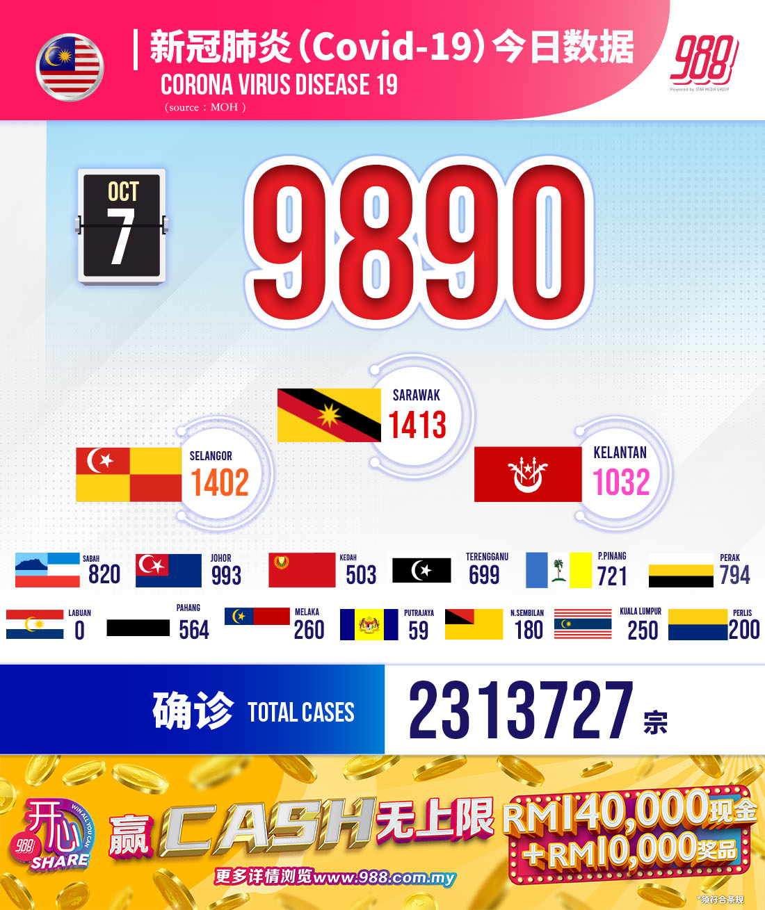 卫生部通报,截至7日12pm,我国新增 #9,890例,累计病例至今 # 2,313,727 宗。