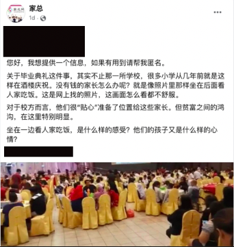 这位网民写道:“关于毕业典礼这件事,其实不止那一所学校,很多小学从几年前就是这样在酒楼庆祝。”