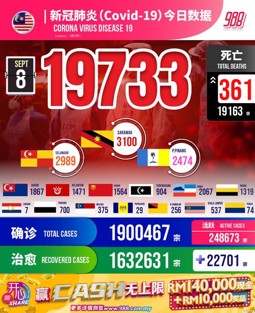 卫生部通报,截至8日12pm,我国新增 #19,733例,累计病例至今 #1,900,467宗,新增361死累计#19,163死。