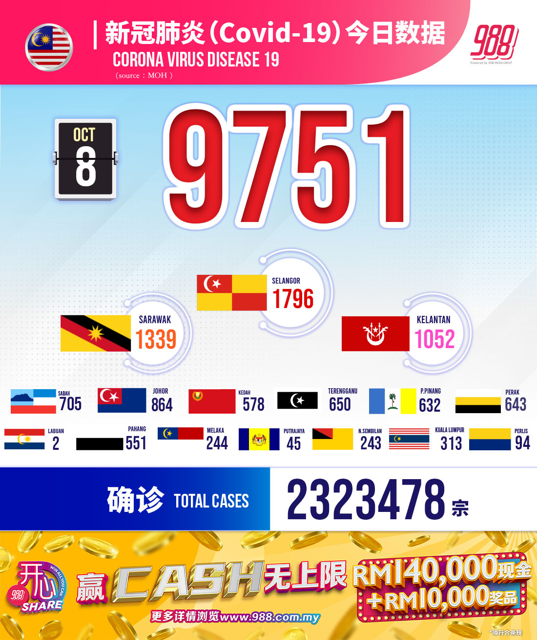 卫生部通报,截至8日12pm,我国新增 #9,751例,累计病例至今 # 2,323,478 宗。