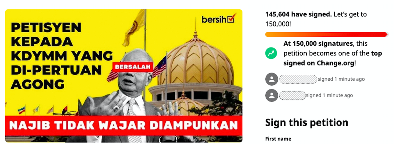 净选盟(Bersih)在change.org平台上发起网络联署“向国家元首陛下请愿:纳吉不值得赦免”,截至今午12时,已逾14万5000签名,快达到15万人目标。
