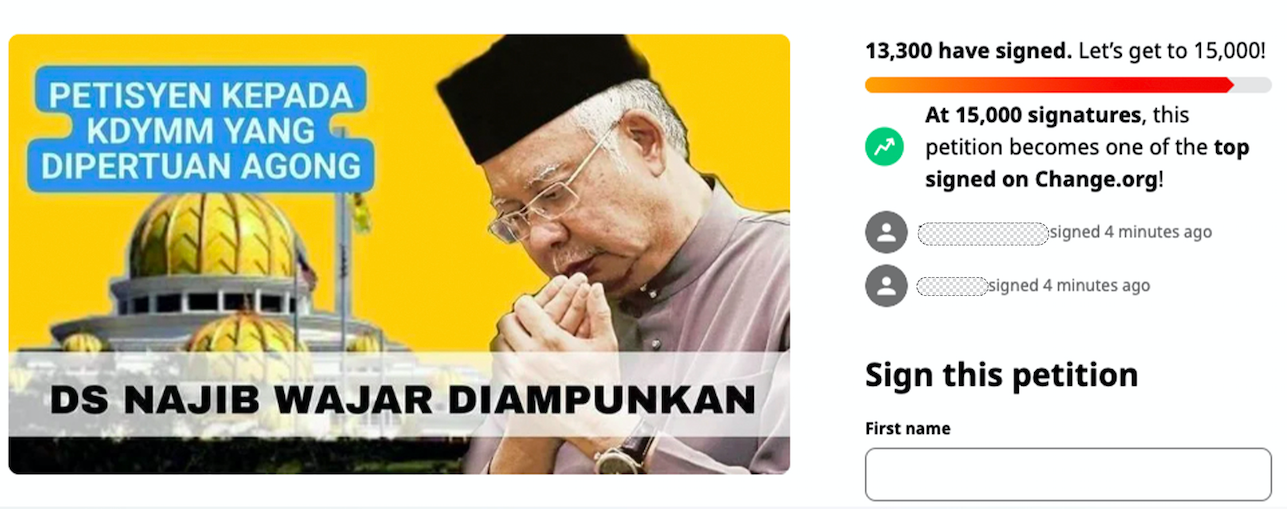 14万5000人向国家元首陛下请愿,反对特赦前首相纳吉!仅1万3000人支持特赦。