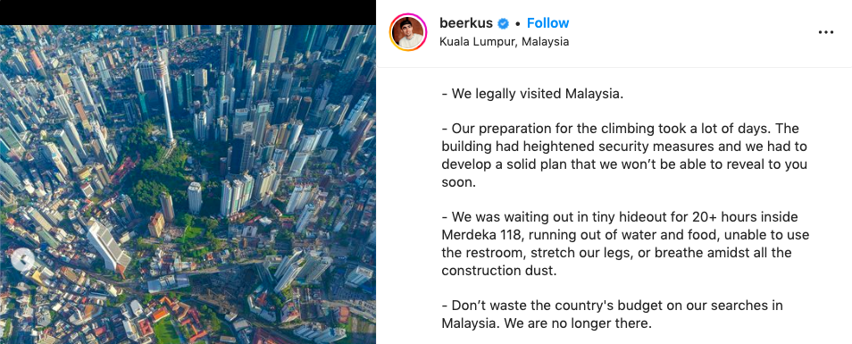 日前登上默迪卡118大楼的俄罗斯不怕死情侣强调,是合法入境我国,更放话大马政府,不用浪费公帑寻找他们的下落,因为他们已经离开大马!