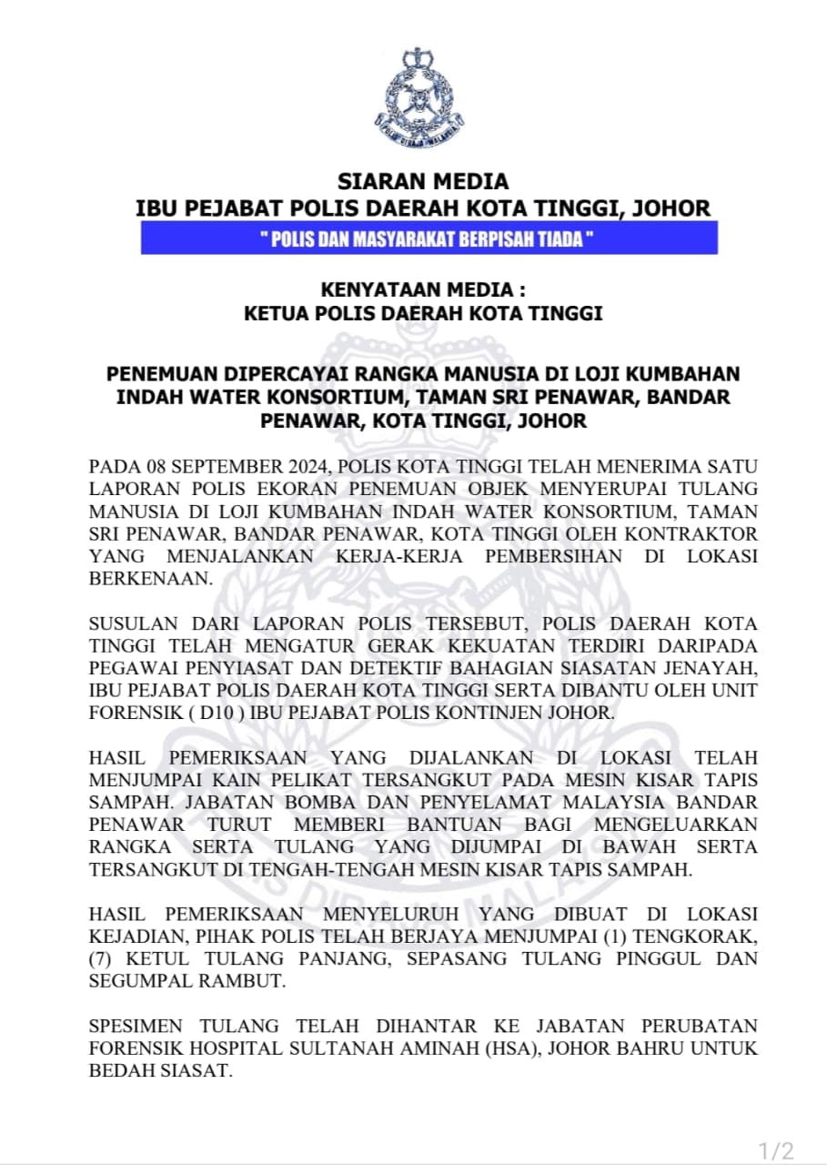 哥打丁宜警区主任尤索夫发文告指出,一名承包商于9月8日,到英达丽水集团位于本那哇镇斯里本那哇花园的污水处理厂,展开清理工作时,意外发现一些疑似人类的骨骸。