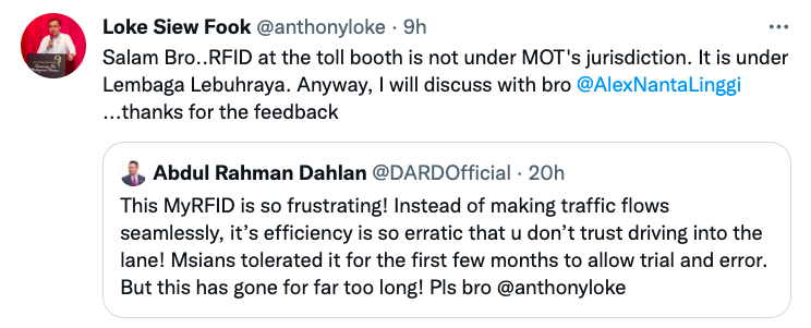 “大道收费站的RFID并不在交通部的管辖范围内。这隶属大道局,无论如何,我会和(工程部长)阿历山大南达林奇讨论这件事。谢谢你的反馈。”