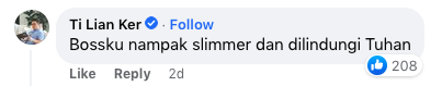 马华副总会长郑联科也留言说:“Bossku看起来更瘦了,也获得上苍庇佑。”
