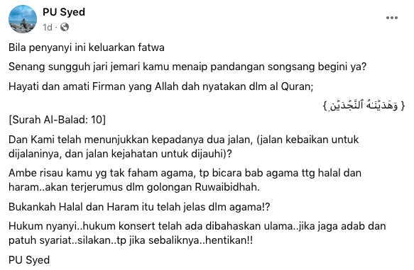 伊党领袖接连对海外艺人来马开演唱会而不满,要求政府禁止外国的歌手来马举办演唱会,而最新抗议对象是英国天团Coldplay!本地马来流行乐女歌手诺阿茜玛(艺名“Baby Shima”)忍不住发文呛声,若觉得看演唱会是非法(Haram),就待在家里或祈祷室,结果这番言论引起宗教师PU Syed不满。