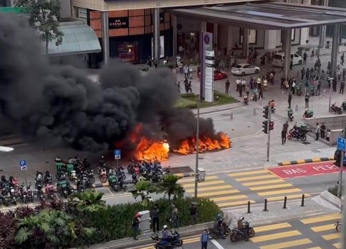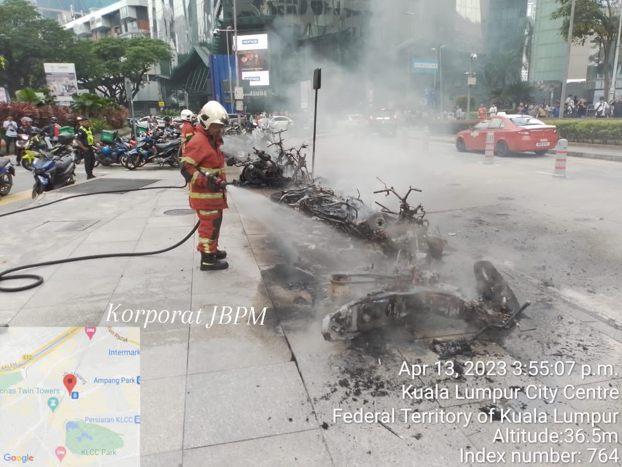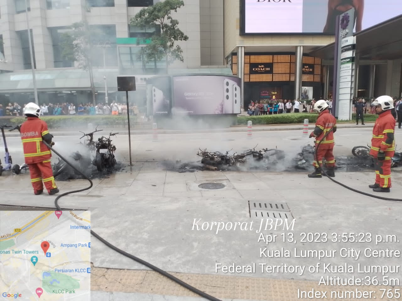 昨日吉隆坡城中城阳光广场(KLCC)前发生火灾,17辆停放在商场前的摩托车和电动滑板车被烧毁,警方证实是一起纵火案,已逮捕1名男子协助调查。