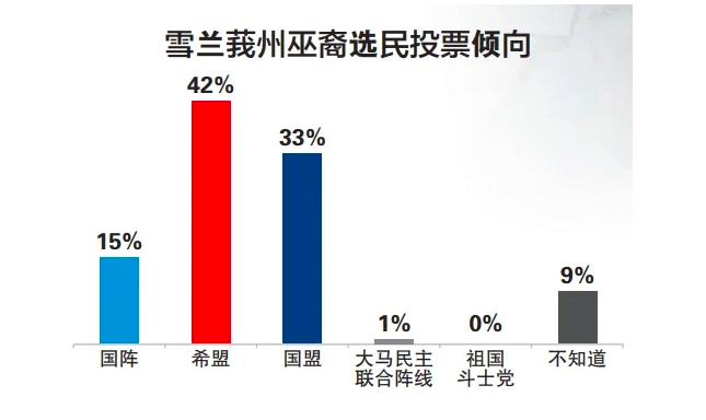 一项针对雪兰莪州巫裔选民的民调结果显示,42%的受访者支持希盟、国阵15%、国盟33%,没有一个联盟在雪州选举中占有绝对优势。