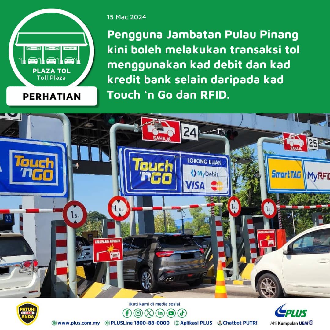 南北大道公司(PLUS)在脸书发文指,除了一触即通卡和无线射频识别(RFID) 卡外,用户即起可以使用信用卡或扣账卡付过桥费。