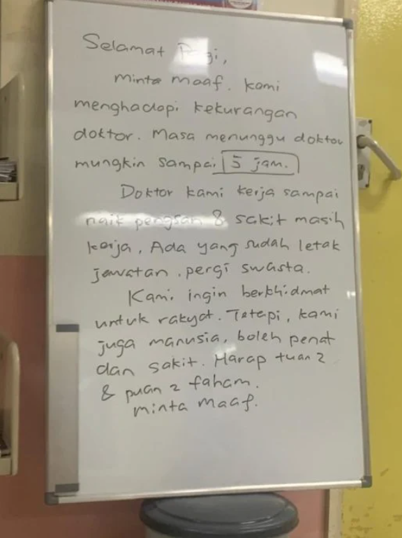 国内医护人员严缺问题有待解决,社媒近日流传一张照片,相信是政府医院的白板,写着:“由于面临医生短缺问题,等待医生时间或需长达5小时。”