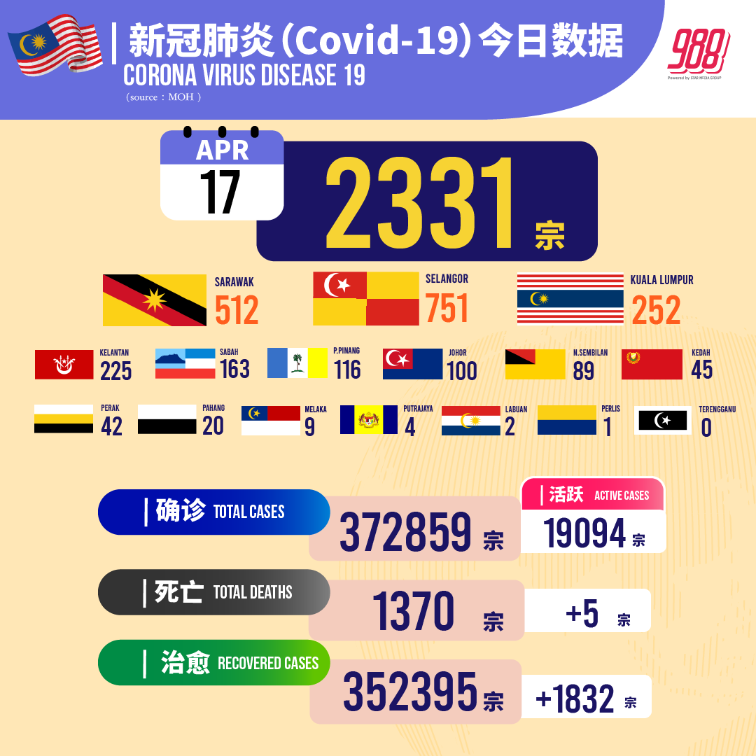 卫生部通报,截至17日12pm,我国新增 #2331例,累计病例至今 # 372,859 宗,新增5死累计#1370死。