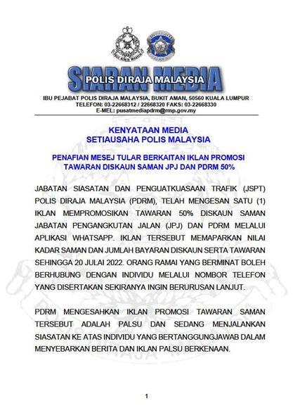 大马皇家警察部队秘书诺茜雅发文告说, WhatsApp流传一则交通罚单折扣50%的假消息,注明折扣截止日期是7月20日,并附有联系人的联络方式。