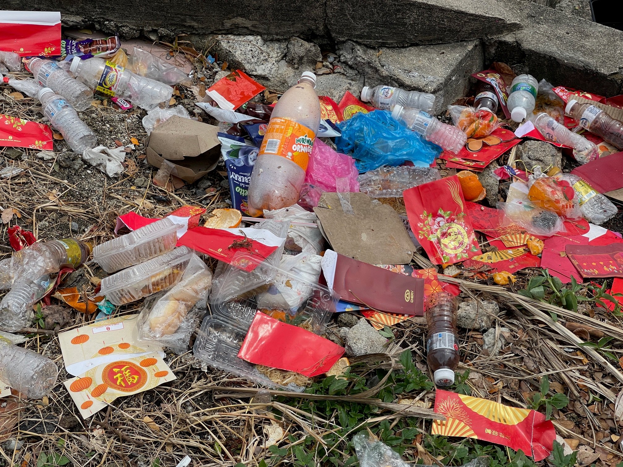 截至今日中午时分,仍有逾百名“丐帮”大军蹲守在天公坛下,留下一大堆垃圾包括红包封、塑料瓶、塑料便当盒、铝罐、零食袋、柑皮及吃不完的食物等。