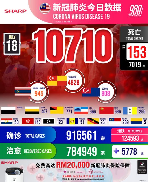 📌今天有153人死,分别来自雪州(82)、吉隆坡(17)、森美兰(14)、柔佛(10)、吉打(8)、彭亨(6)、马六甲(5)、沙巴、槟城、布城各2人、登嘉楼、砂拉越、吉兰丹、霹雳和纳闽各1人
