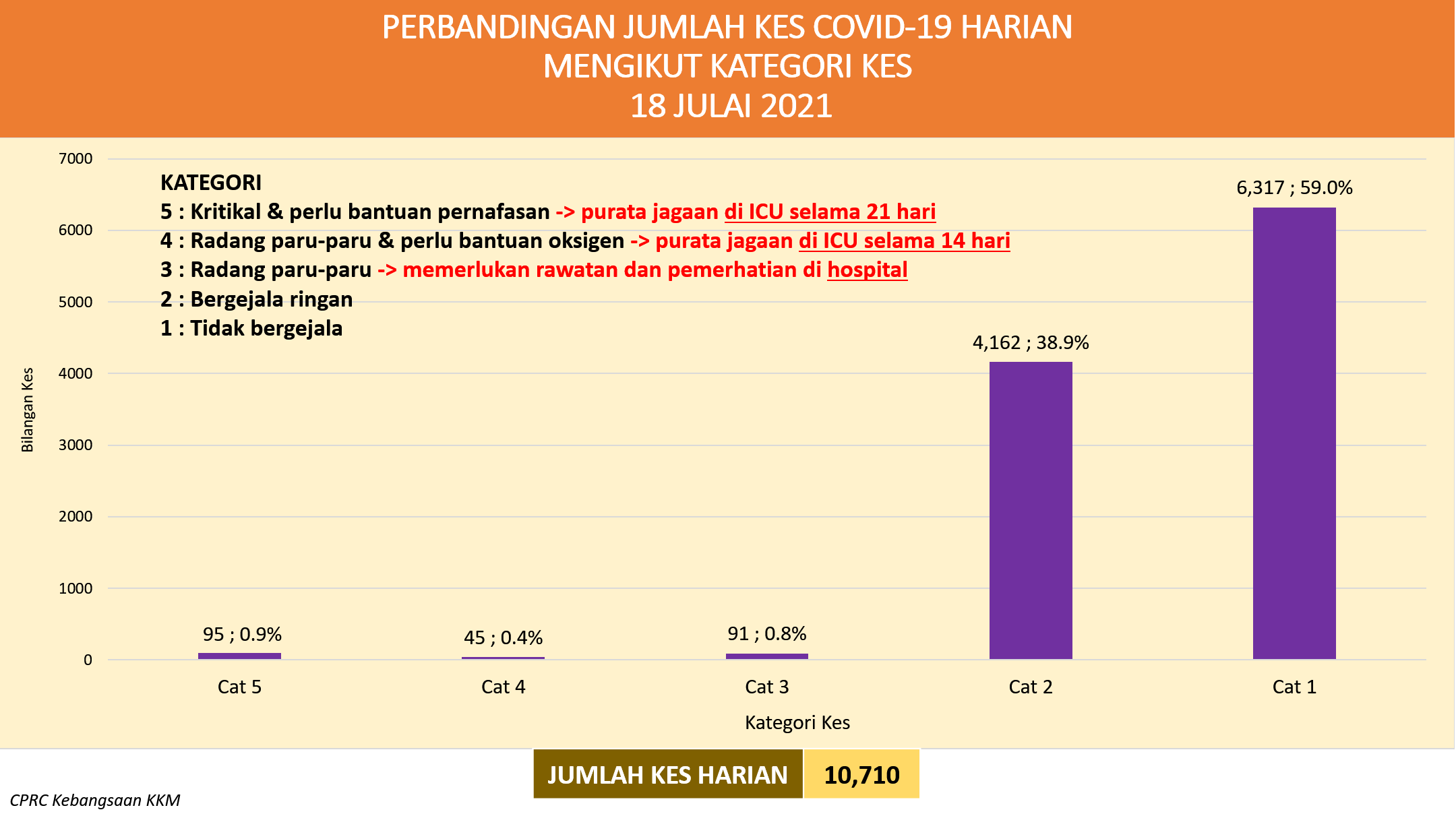 📌10,710确诊病例中,95宗(0.9%)是第五级患者、45宗(0.4%)第4级患者、91宗(0.9%)第三级患者、4162宗(38.9%)第二级患者和6317宗(59%)第一级患者