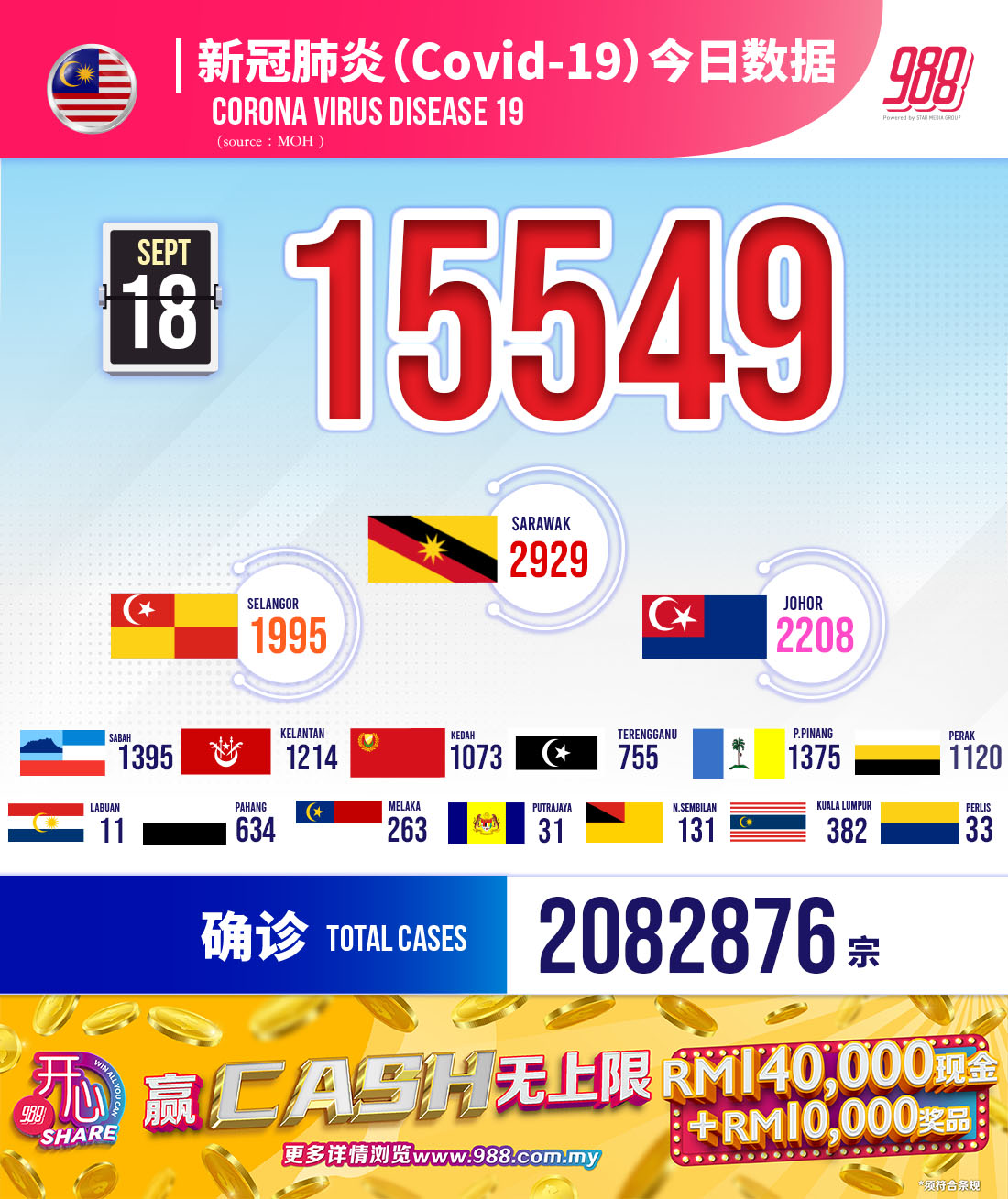 卫生部通报,截至18日12pm,我国新增 15,549例,累计病例至今2,082,876宗。