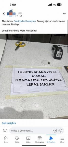 为了提醒顾客吃完之后自行收拾,吉隆坡一家Family Mart便利店贴出告示,但有关告示竟然侮辱残疾人士,结果引起热议,马来西亚Family Mart就此事在脸书贴文道歉!