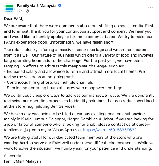 对此,马来西亚Family Mart在脸书贴文道歉,并指零售业目前面临大规模的劳动力短缺问题,而他们也未能幸免。