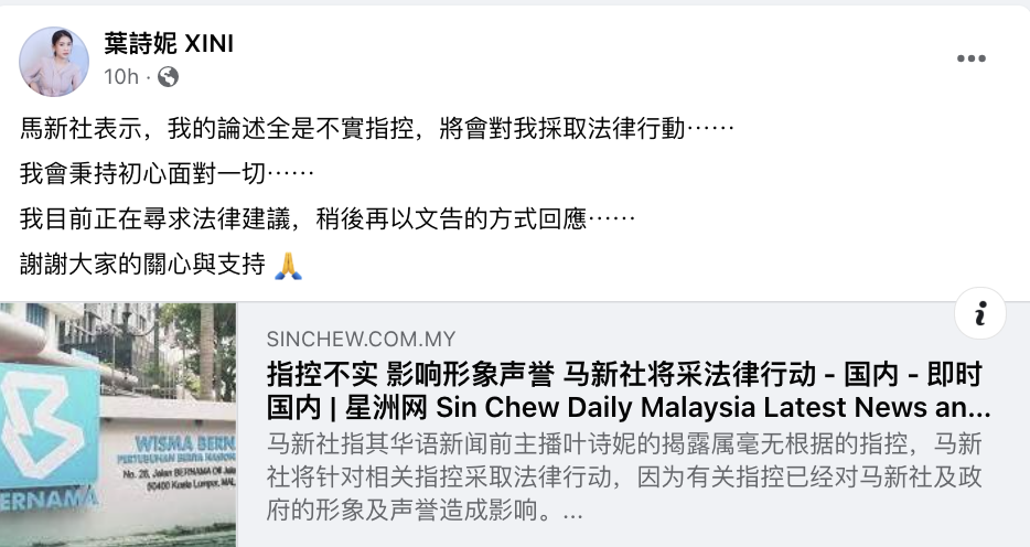 另一方面,针对马新社将采取法律行动,叶诗妮在转发该新闻后撰文说,她会秉持初心面对一切,并透露自己正在寻求法律建议,稍后也会回应,并谢谢大家的关心。