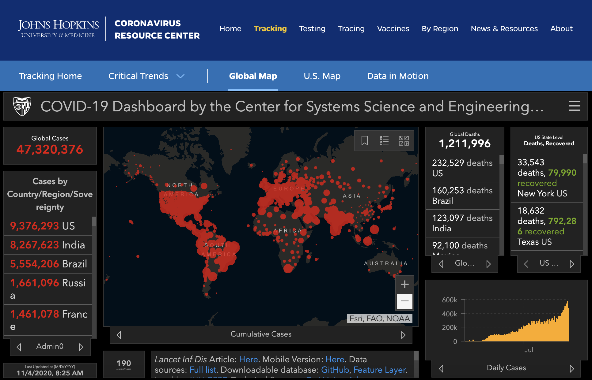 ➡️疫情肆虐全球至少 #188国/地区,截至今早8.25am,美国约翰斯·霍普金斯大学实时统计:全球累计确诊病例47,320,376例,累计死亡1,211,996例。