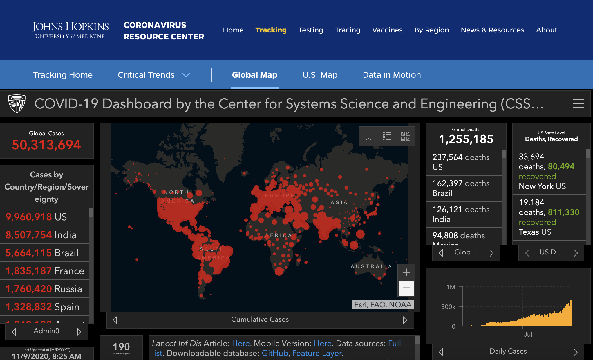 ➡️疫情肆虐全球至少 #188国/地区,截至今早7.25am,美国约翰斯·霍普金斯大学实时统计:全球累计确诊病例50,313,694例,累计死亡1,255,185例。