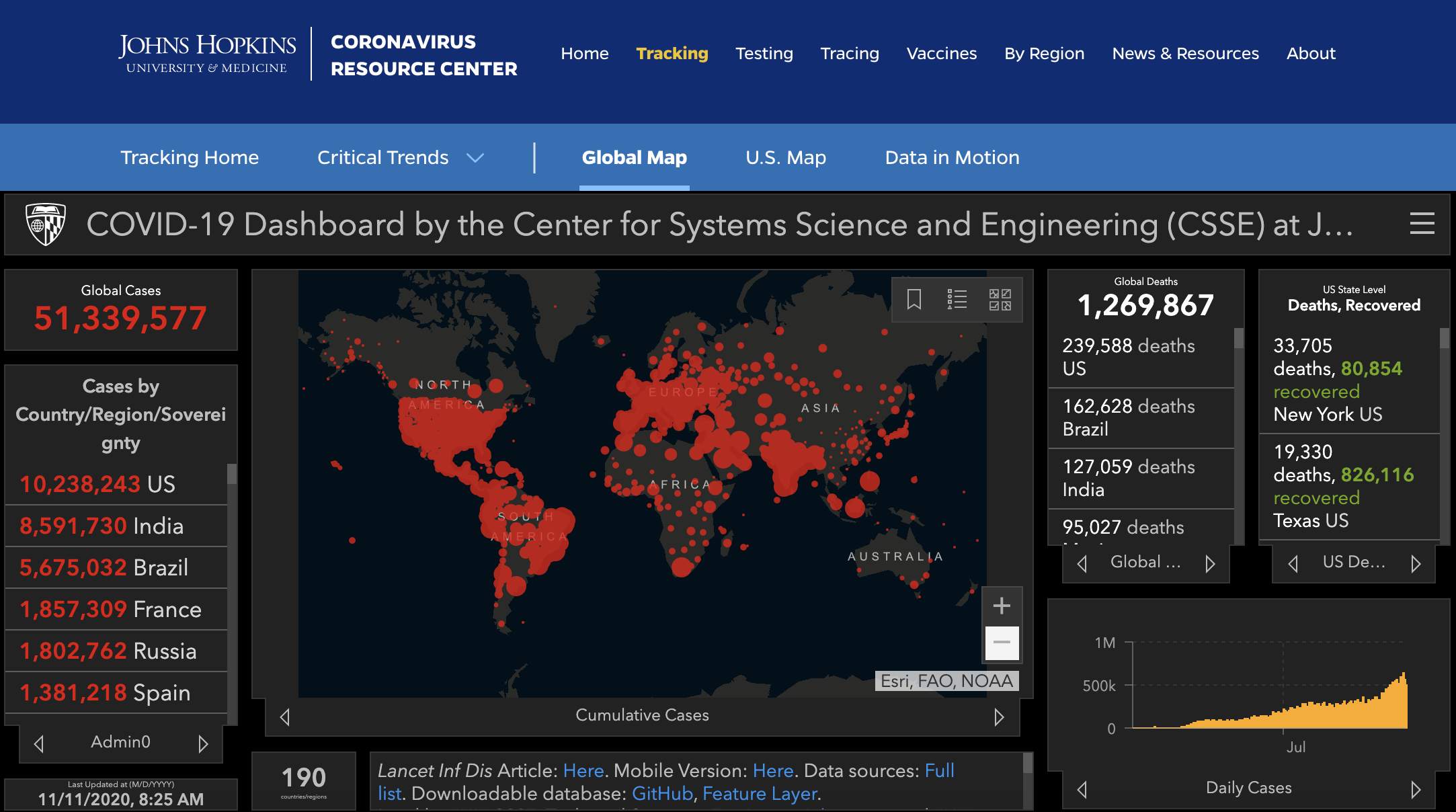 ➡️疫情肆虐全球至少 #190国/地区,截至今早8.25am,美国约翰斯·霍普金斯大学实时统计:全球累计确诊病例51,339,577例,累计死亡1,269,867例。