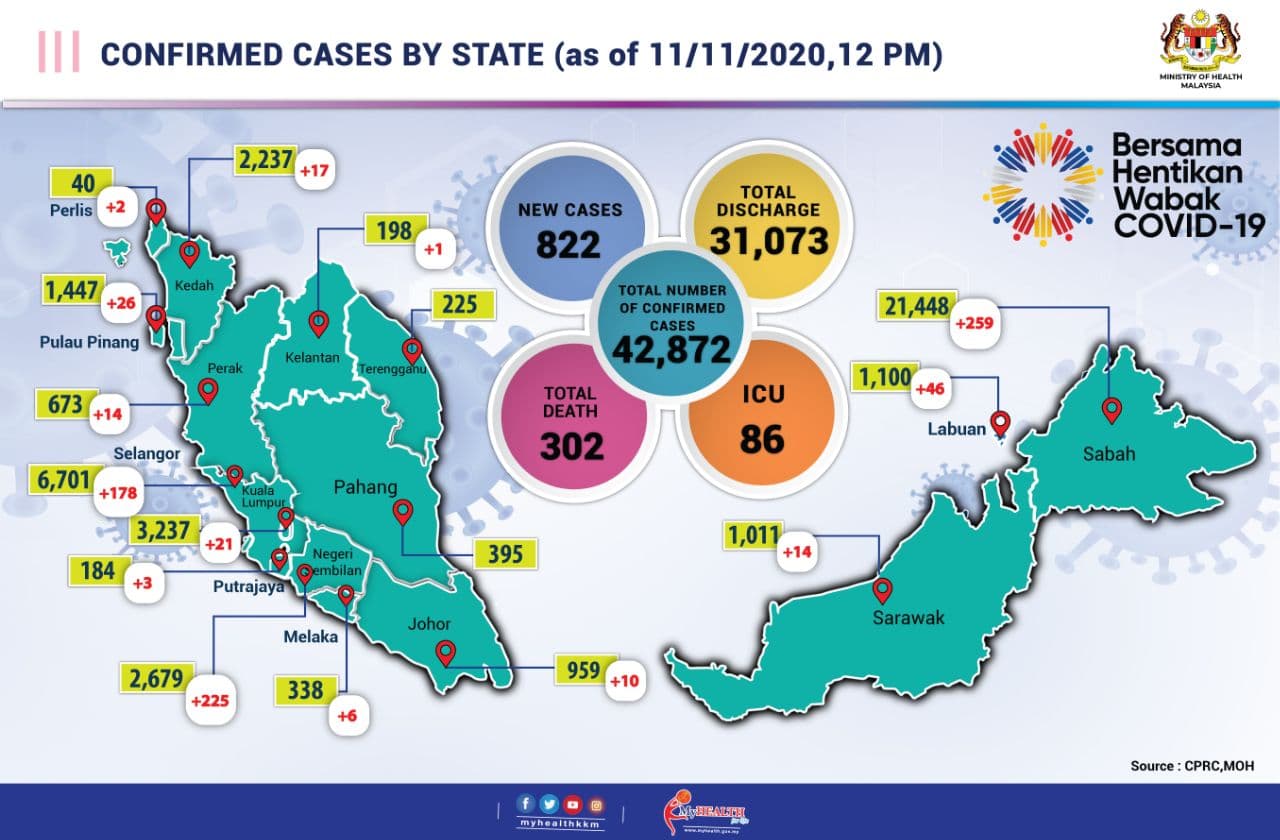 卫生部通报,截至11日12pm,我国新增 #822例,累计病例至今 #42872宗, 2人死,累计 #302死。