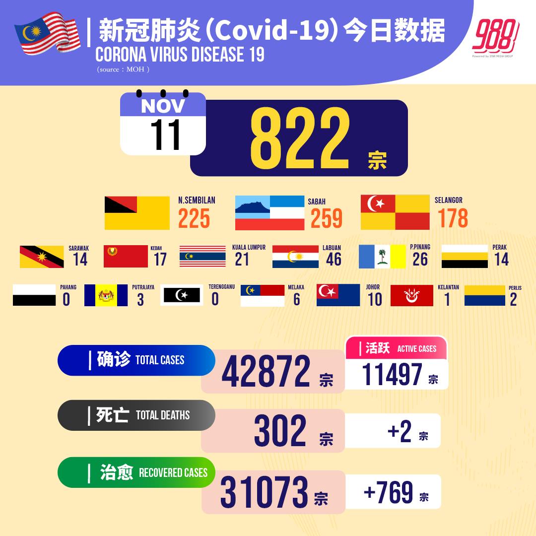 ➡️截至11日12pm,我国新增 #822例,累计病例至今 #42873宗,增2宗死亡病例,维持 #302死;其中7例是境外输入,815例是本土感染病例。