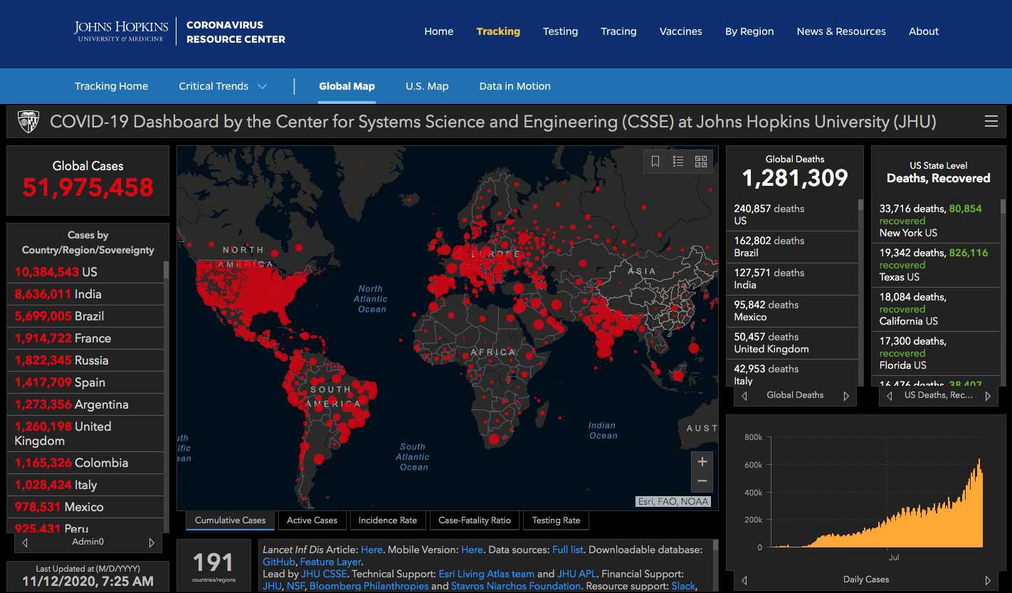 ➡️ 疫情肆虐全球至少 #191 国/地区,截至今早8am,美国约翰斯·霍普金斯大学实时统计:全球累计确诊新冠肺炎病例51,975,458例,累计死亡1,281,309例。