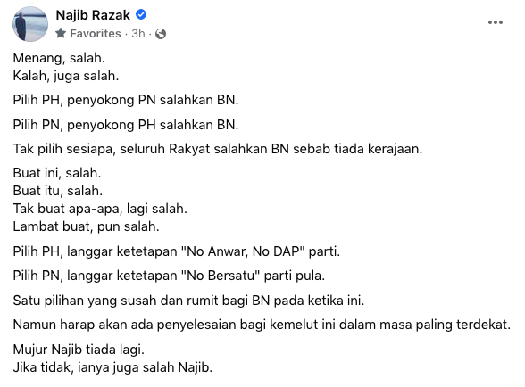 他今天在脸书贴文说:赢也错,输也错;选希盟,国盟的支持者怪国阵;选国盟,希盟的支持者怪国阵;谁也不选,全国人民怪国阵导致国家没有政府。