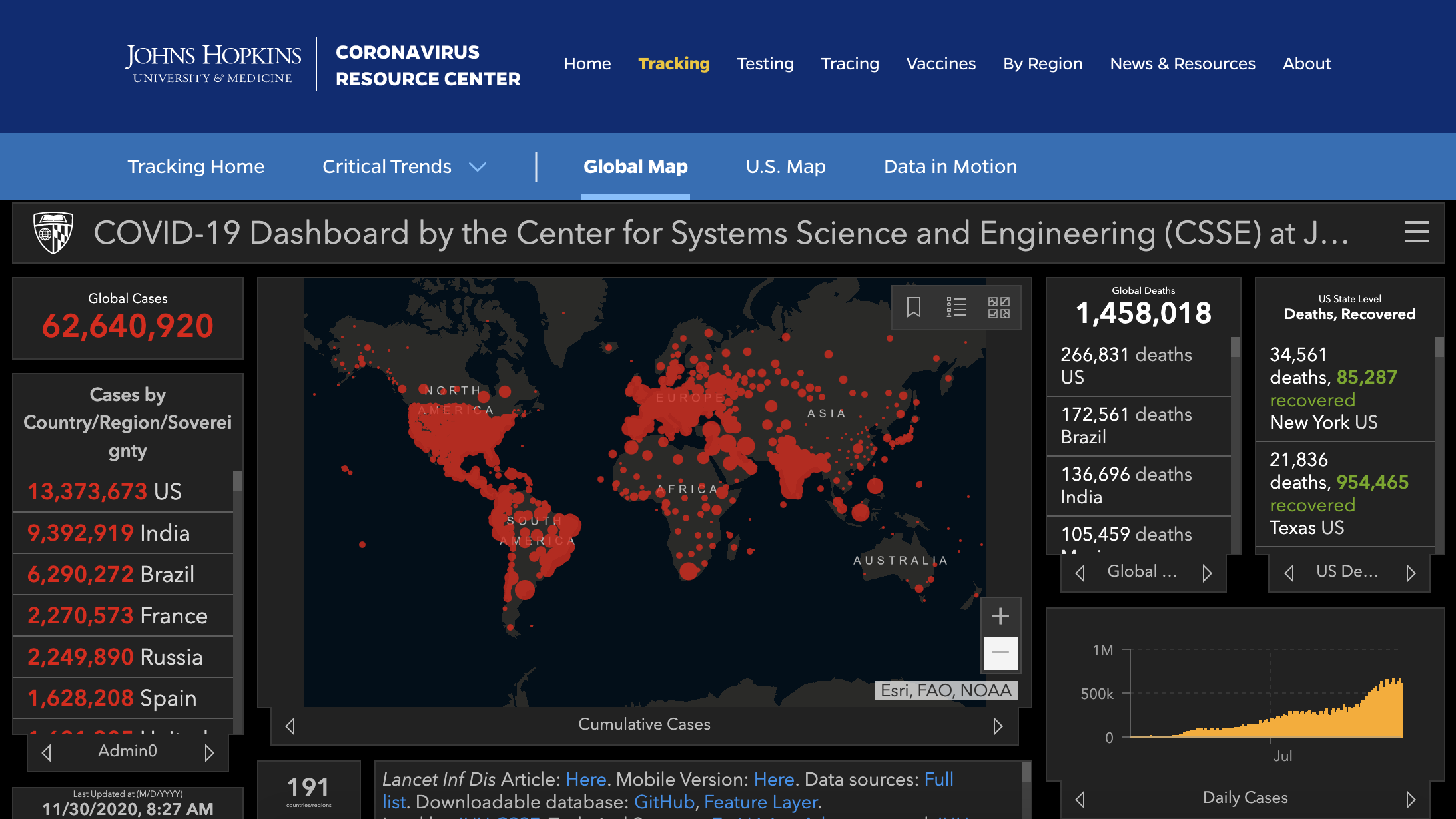 ➡️疫情肆虐全球至少 #191国/地区,截至今早8.27am,美国约翰斯·霍普金斯大学实时统计:全球累计确诊病例62,640,920例,累计死亡1,458,018例。