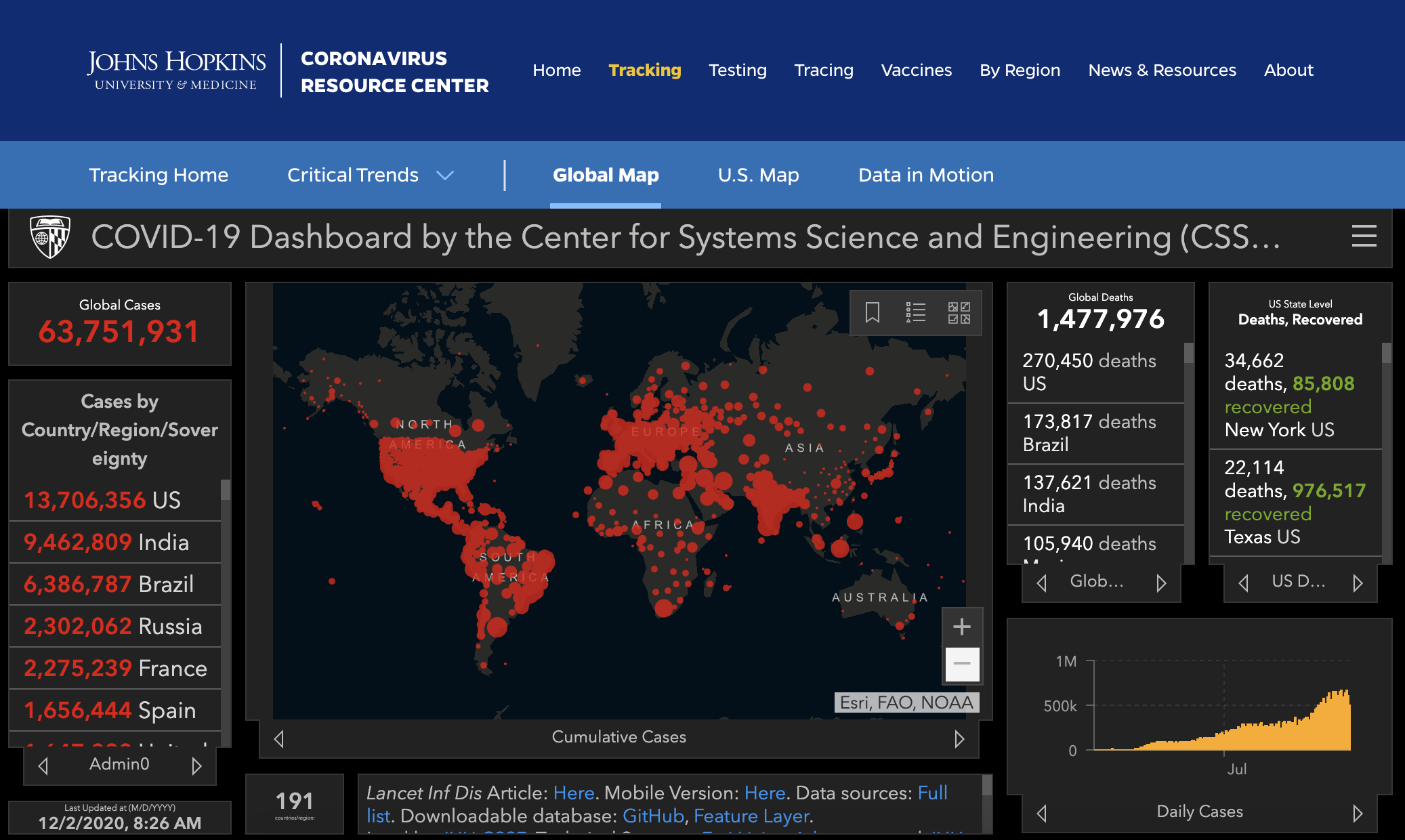 ➡️疫情肆虐全球至少 #191国/地区,截至今早8.28am,美国约翰斯·霍普金斯大学实时统计:全球累计确诊病例63,751,931例,累计死亡1,477,976例。