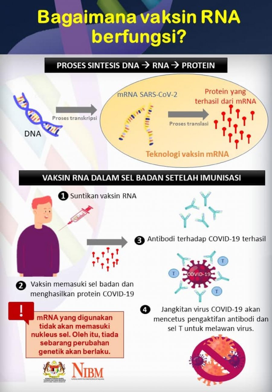 ➡️科艺部释出RNA疫苗作用原理的资讯图向公众加以阐释接种情况。根据图表显示,注射RNA疫苗后,疫苗进入体内教导细胞如何制造出一种对付病毒的特有无害蛋白质,从而触发人体内的免疫反应。由于疫苗mRNA不会进入细胞核,所以不会为基因带来变化。