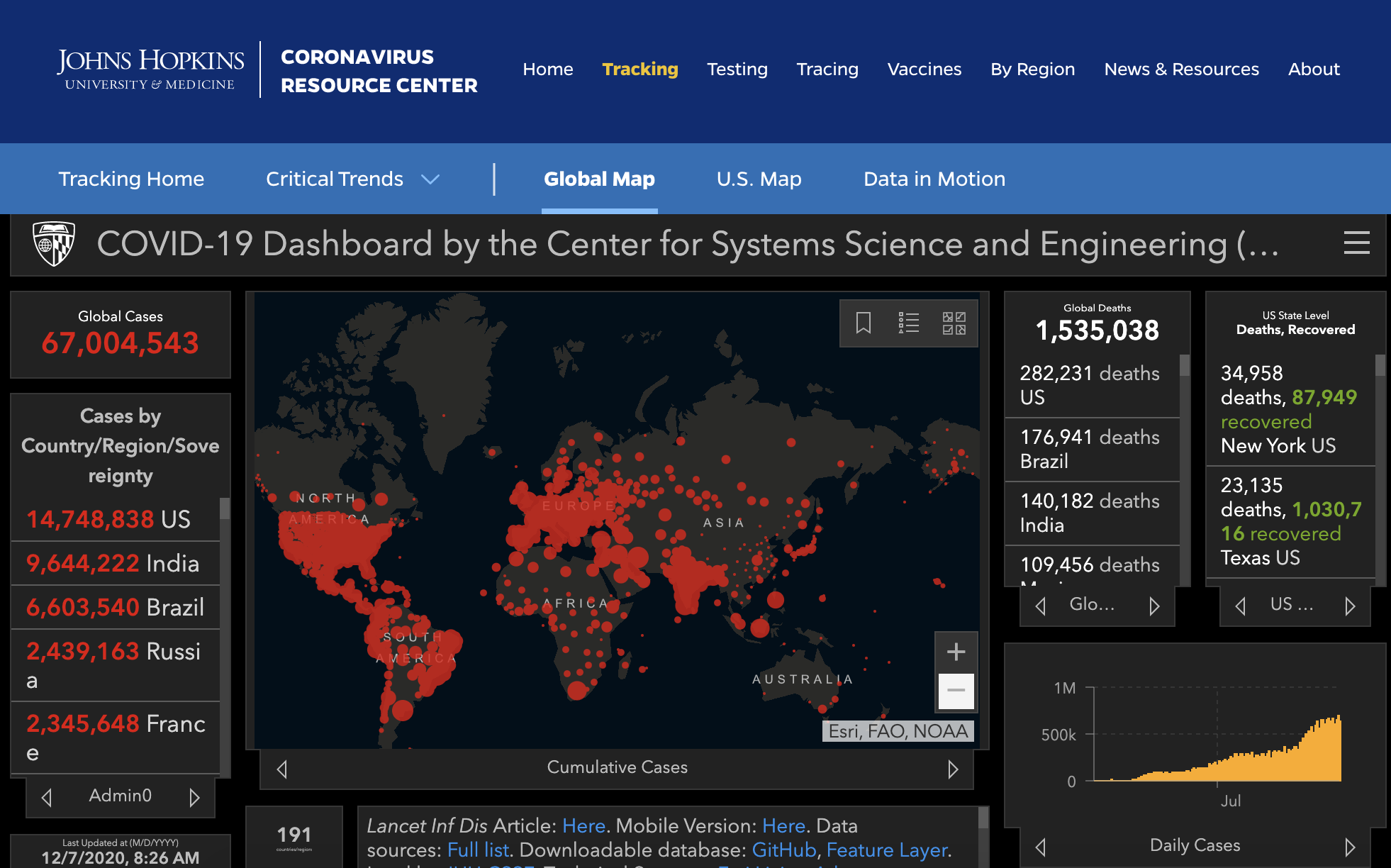 ➡️疫情肆虐全球至少 #191国/地区,截至今早8.26am,美国约翰斯·霍普金斯大学实时统计:全球累计确诊病例67,004,543例,累计死亡1,535,038例。