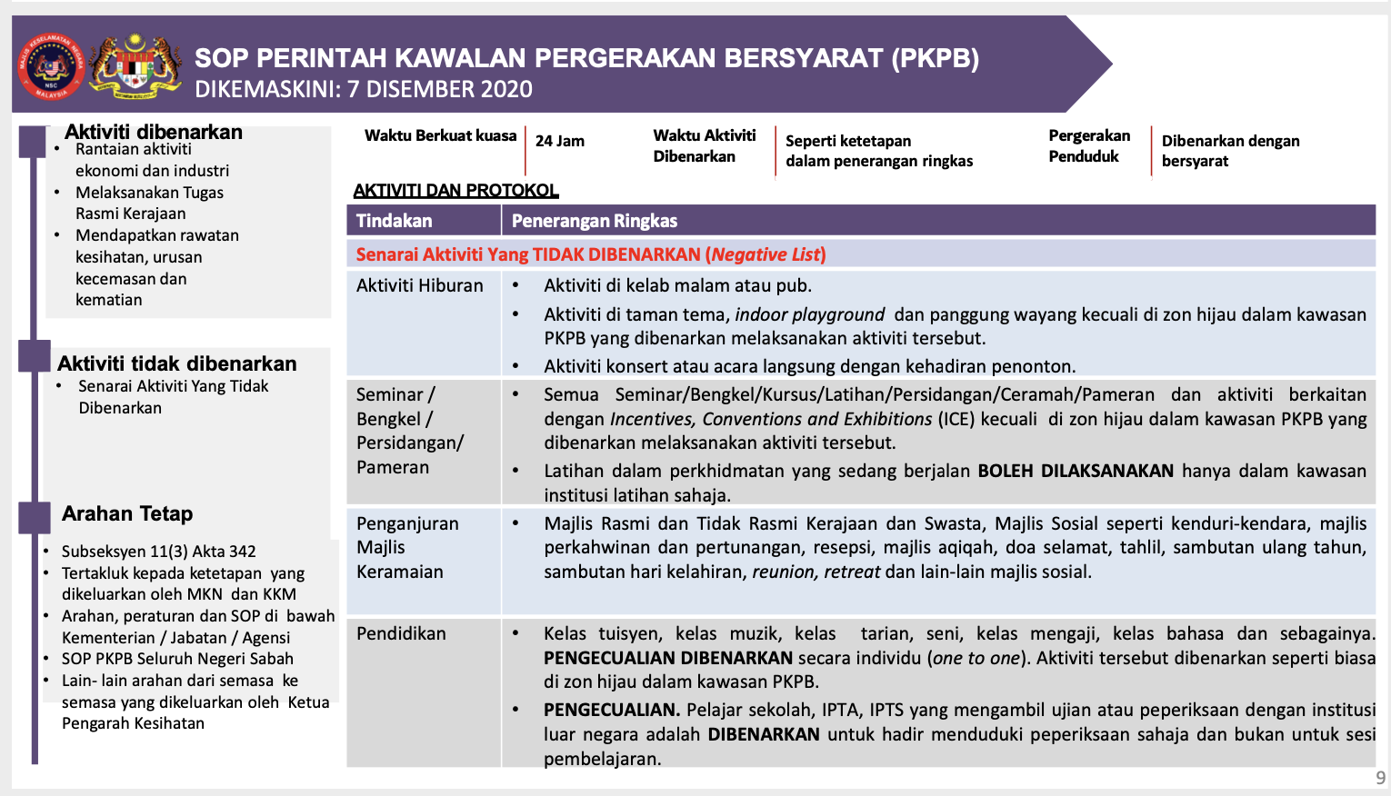 另一方面,在新SOP下,部分休闲活动、会展、训练、课程、展览、教育和旅游活动等,都允许在CMCO区内的绿区进行。