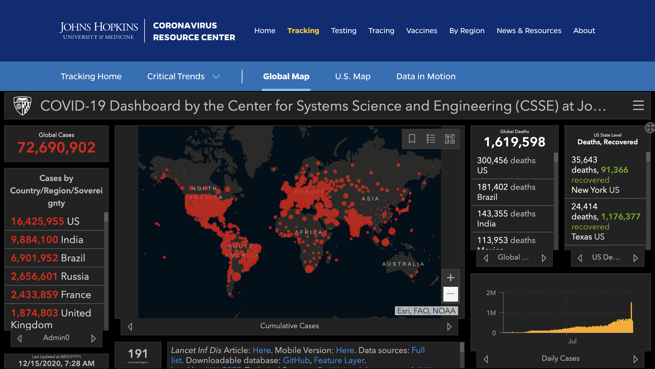 ➡️疫情肆虐全球至少 #191国/地区,截至今早7.28am,美国约翰斯·霍普金斯大学实时统计:全球累计确诊病例72,690,902例,累计死亡1,619,598例。