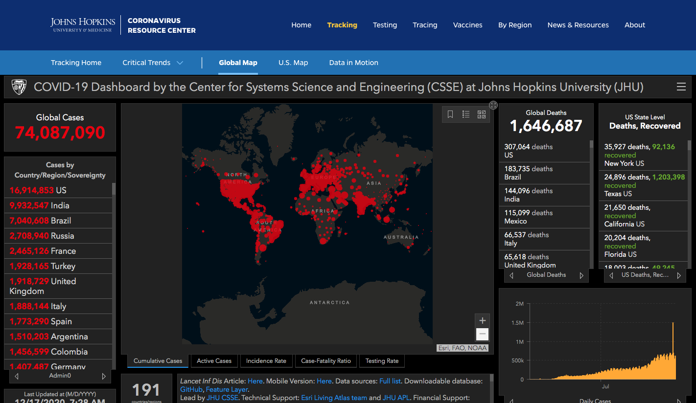 ➡️ 疫情肆虐全球至少 191 国/地区,截至今早8am,美国约翰斯·霍普金斯大学实时统计:全球累计确诊新冠肺炎病例74,087,090例,累计死亡1,646,687例。
